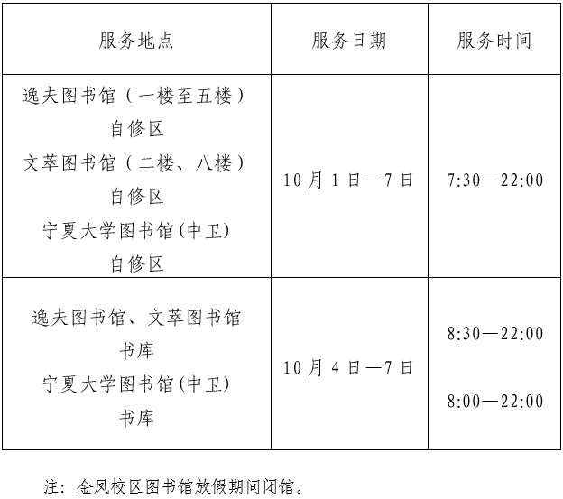 根据宁夏大学《关于国庆节放假的通知》(宁大办发〔2024〕68号)安排, 10月1日—3日为法定节假日,图书馆只提供自修服务。10月4日—7日,各书库正常开放。