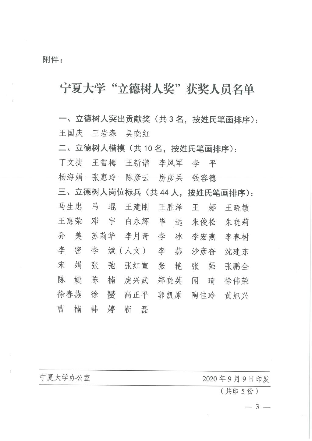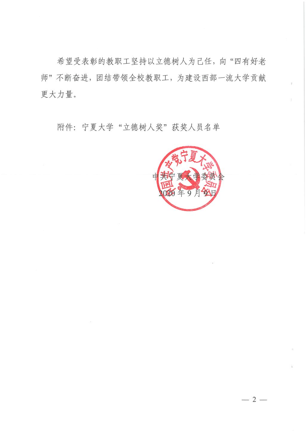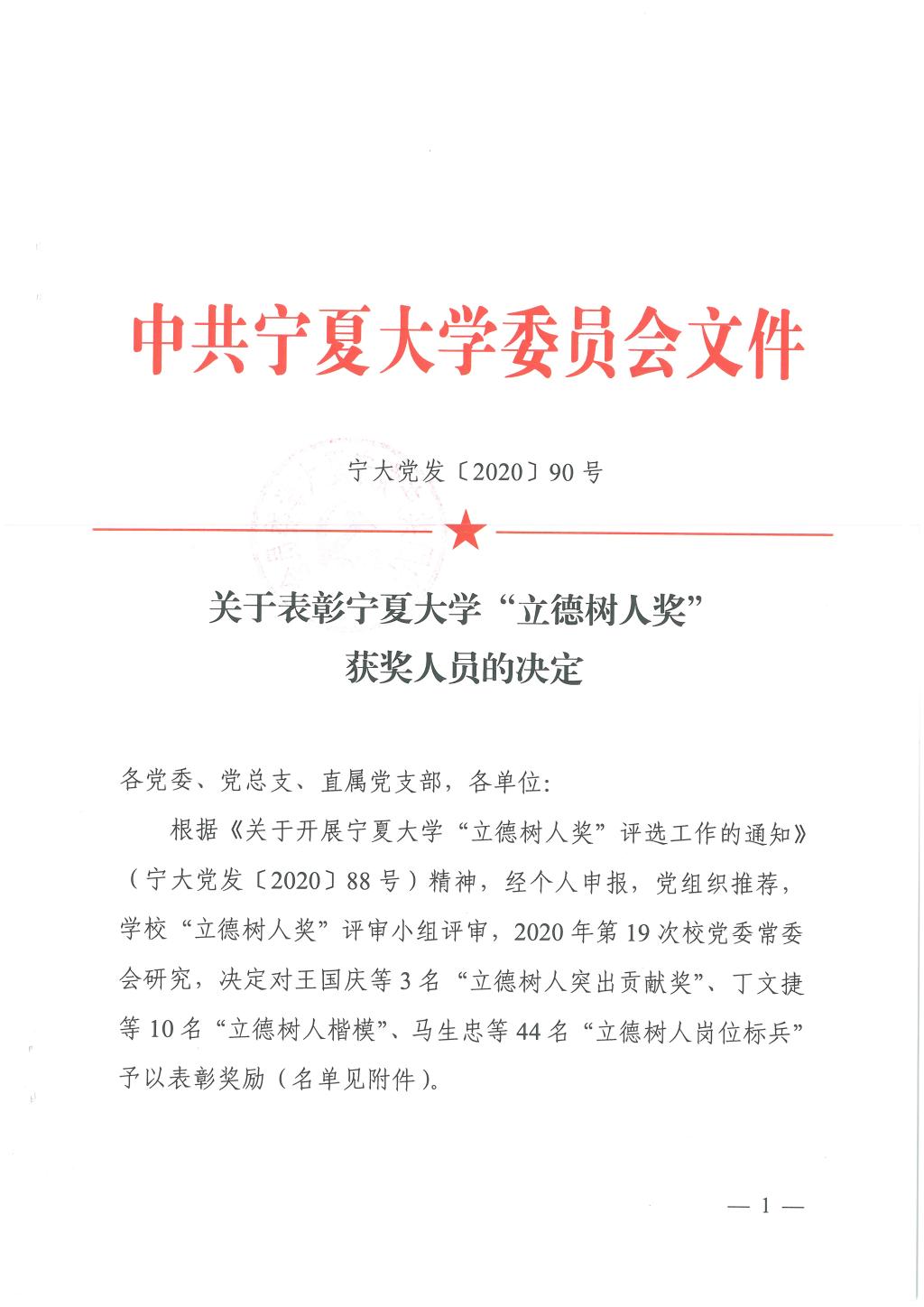 关于表彰宁夏大学“立德树人奖”获奖人员的决定 (宁大党发〔2020〕90号)