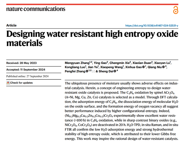 【宁夏大学新闻中心讯 前沿科学与技术学部】近日,宁夏大学化学化工学院张鹏飞课题组在高熵氧化物抗水机制研究方面取得进展。该工作以“Designing water resistant high entropy oxide materials”为题发表在国际重要期刊《Nature Communications》。该论文第一作者为博士生张梦媛,张鹏飞教授为唯一通讯作者,宁夏大学为第一完成单位。该研究提出了工程熵的概念来设计耐水氧化物催化剂。以尖晶石ACr2O4(A=Ni、Mg、Cu、Zn、Co...