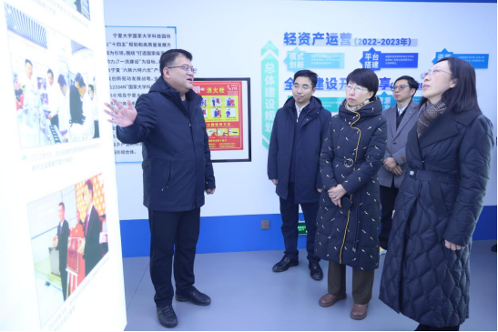 【宁夏大学新闻中心讯 创新创业学院】12月11日,教育部学校建设规划发展中心主任孙明春一行到访宁夏大学创新创业学院、国家大学科技园调研指导,自治区教育厅党组成员、副厅长马丽,校党委常委、副校长李学斌及教育厅和学校相关部门负责人陪同调研。孙明春一行先后参观了学院数字化展厅、数字化模拟实验室、创客咖啡、创客书吧等空间,详细了解校企合作项目“宁夏智慧文旅大数据平台”及基于文旅大数据的数字人产品和大学科技园...