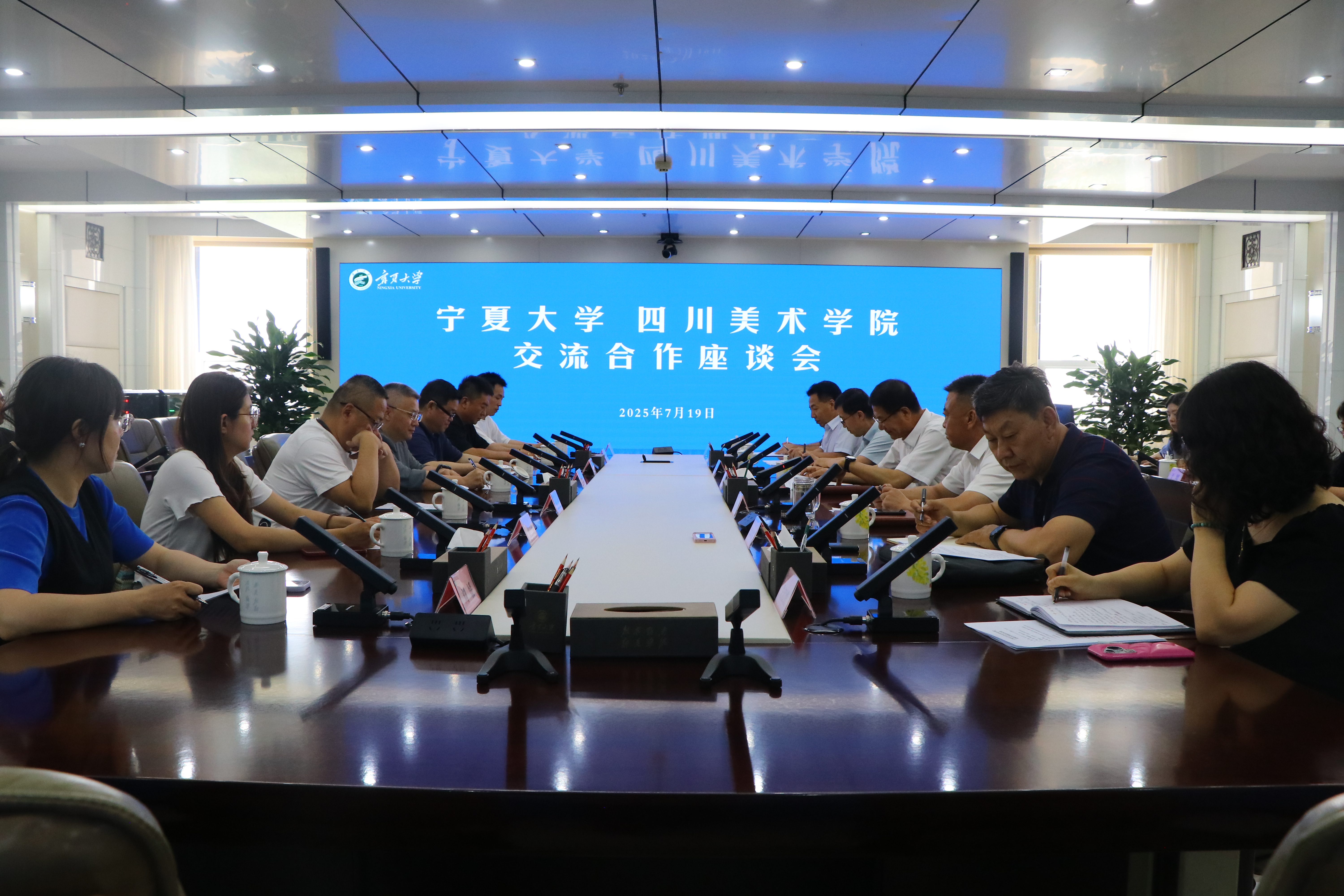 【宁夏大学新闻中心讯 王晓东/文、图】7月19日,四川美术学院党委书记唐青阳,四川美术学院教授、中国美术家协会副主席庞茂琨一行来校调研交流,校党委书记王宏伟出席并主持两校交流合作座谈会。校党委副书记张桓和四川美术学院造型艺术学院院长唐勇分别介绍了两校发展历程、办学规模、师资队伍、人才培养、学科建设等方面的情况。与会人员围绕专业建设、学科发展、智慧教育融入、科研平台打造、交流合作等方面作了深入交流探讨。庞茂琨在交流时指出,美术创作应深度扎根地方文化土壤,宁夏的黄河文化等资源禀赋为艺术创作提供了丰富素材,西部地区院校需正视发展中的资源配置、人才留存等困惑,把握“一带一路”建设、西部大开发等战略机遇,加强团队协作。他表示,中国美术家协会将持续通过创作扶持、展览交流等方式,为西部美术创作提供平台支持。唐青阳对宁夏大学作为“新时代西部大开发与西部高校艺术学联盟”成员之一并全力支持工作表示感谢。他指出,...