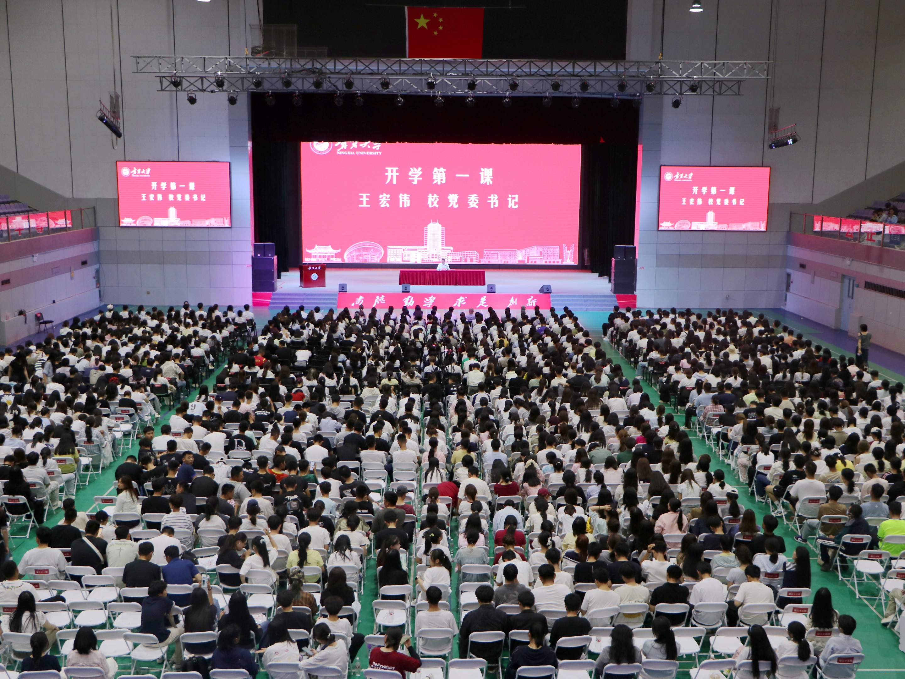 【宁夏大学新闻中心讯 冯禹君/文 李明花/图】梦想从大学起航,未来由青春定义。为切实做好大学生思想政治教育工作,引导2025级新生以崭新面貌开启新征程、以奋斗姿态迎接新挑战、以笃实之行书写新答卷,勇做走在时代前列的奋进者、开拓者,9月10日下午,校党委书记王宏伟为2025级全体新生讲授以《算好“三笔账” 砥砺家国情 争做堪当民族复兴重任的时代新人》为主题的“开学第一课”。校党委常委、副校长黄河主持。王宏伟从“算好‘自己的账’——做对自己负责的追梦者”“算好‘家长的账’——做让家人放心的传承者”“算好‘国家的账’——做为国家担当的建设者”三个层面,勉励同学们要厘清步入大学的“青春账单”,珍惜韶华、胸怀大我、脚踏实地、勤于圆梦,不负个人的成长、家庭的期盼和国家的未来,为成长为堪当民族复兴重任的时代新人奠定坚实根基。他指出,同学们要算好“自己的账”,清醒地知道步入大学该付出什么、坚守什么,自觉地对自己的时间、...