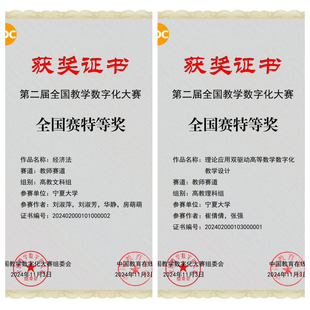 【宁夏大学新闻中心讯 本科生院】11月1日—3日,第二届全国教学数字化大赛全国总决赛在首都经济贸易大学圆满落幕。我校刘淑萍、崔倩倩、李茹一和詹银晓教师团队的参赛作品分别荣获教师赛道文科组特等奖、理科组特等奖、工科组一等奖和二等奖,邓文韬老师指导的刘佳瑶等同学在学生赛道荣获一等奖,宁夏大学荣获优秀组织奖。